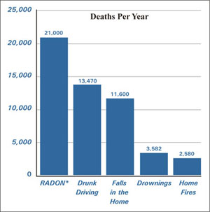Radon induced Lung Cancer causes in excess of 21,000 deaths each year, significantly more deaths than drunk driving, drownings and home fires. In fact it represents almost 40% of the total of the six most common causes of death.